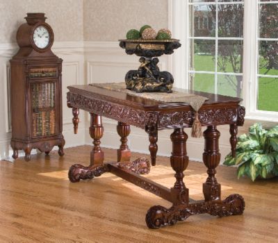 Almost five full feet of ornately hand-carved stylized lions, acanthus leaves and ornate turnings embellish everything from the balustrade's gadroons to the half-foot-wide apron on this Design Toscano signature piece! Requiring well over a week of skilled hand-carving to create, this grande-scale investment in historic furniture art is a celebration of the decorative architecture of the Renaissance. Whether it serves in the library, entry or office, our solid hardwood piece is stylishly distinctive. Simple assembly required. 60"Wx28"Dx30"H. 93 lbs.