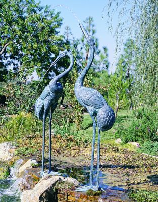 These bronze crane statues, reminiscent of the European tradition of splendid, grand-scale garden art, artistically capture the form and grace of the elegant crane. These bronze statues, finished with an antique verdigris patina, are cast one piece at a time in the traditional lost wax method, which highlights their graceful legs and exquisite, elongated necks and guarantees lasting beauty. Sure to be a focal point, these heirloom-quality bronze statues convey that you take the exterior of your home as seriously as the interior. Piped to optionally cascade flowing water from the cranes beaks into your pond or fountain. Accommodates Pump Kit BB-75850. Each Crane requires its own pump.